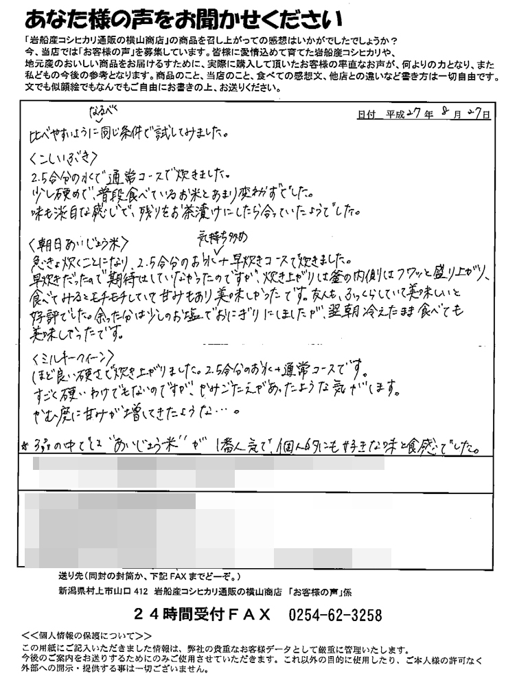 ふるさと新発田をはなれて早30余年、岩船の塩鮭にはこだわつて毎年とりよせておりますが、あのちいさな岩船の地にこんなに美味しいお米があるとは知りませんでした。